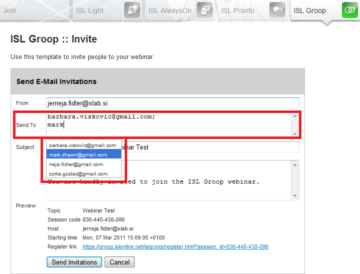 6. Invite your audience. A few minutes before your scheduled webinar or let’s say 30 minutes to be on the safe side, send out invitations to the planned audience. To do that, log into your web account via Product login, click »Add invitations«, enter email addresses of all attendees, and click the »Send invitations« button. All contacts are automatically saved and will show up next time you start filling in the recipient list. However, if you by any chance forget to invite a person to the webinar through the web account, you can always do it during the webinar in the ISL Groop application.